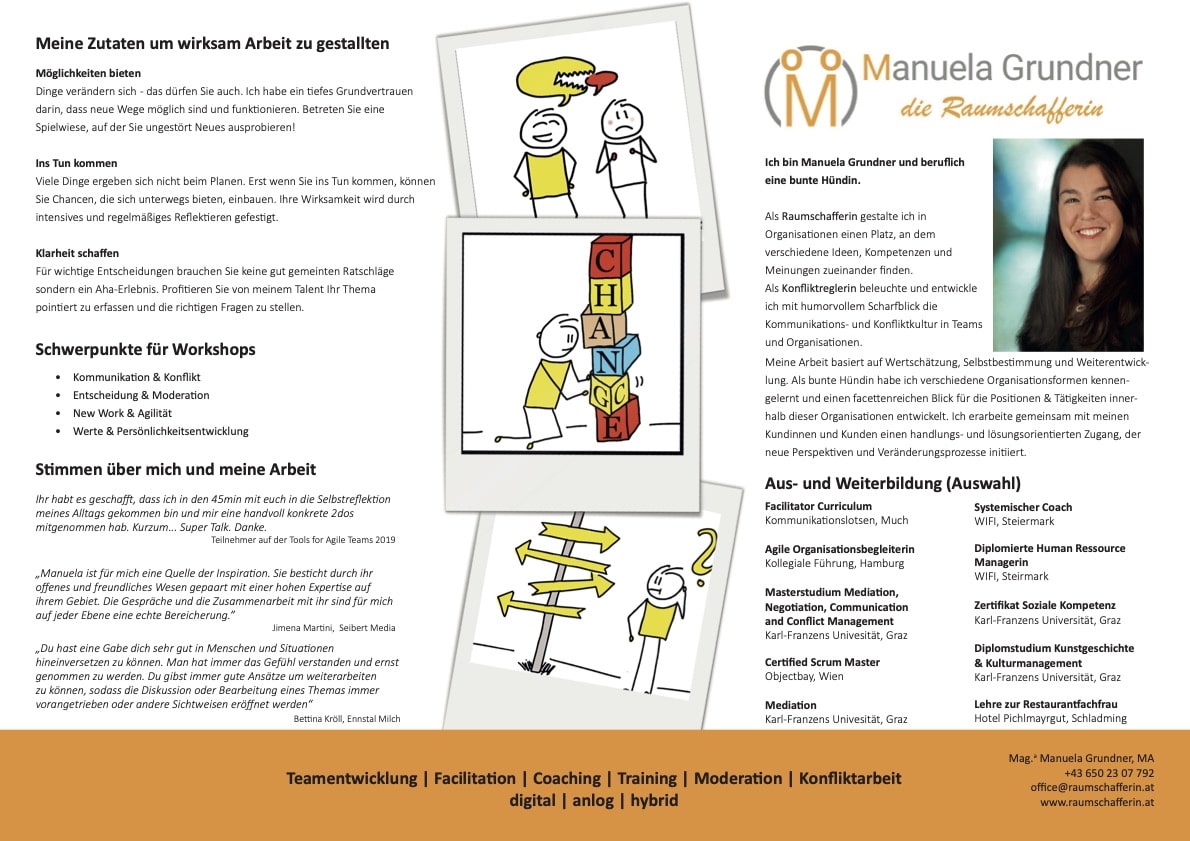 Die Antworten auf meine Fragen haben mich zu meiner heutigen beruflichen Tätigkeit geführt. Als systemische Coach, Teamentwicklerin & Moderatorin konzentriere ich mich darauf, was Du und dein Team brauchst, um jetzt weiter zu kommen.